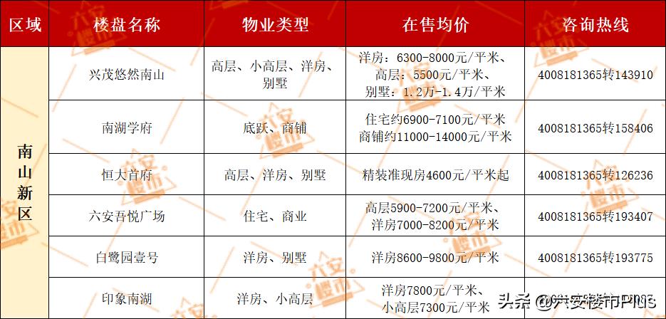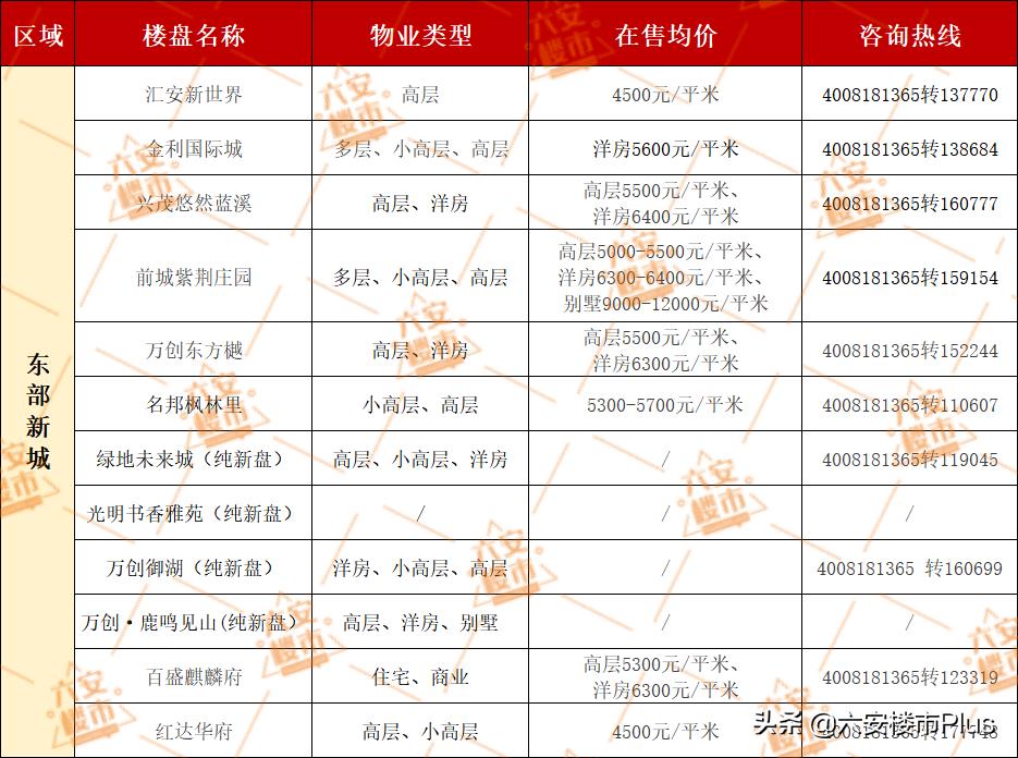 下表为六安各版块各大楼盘最新房价,供大家参考。(注:部分纯新盘大多不确定开盘价格,为数据精确,表格内未统计房价)