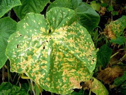 发病症状:真叶染病时初为鲜绿色水浸状斑,渐变成淡褐色、病斑受叶脉限制呈多角形,灰褐或黄褐色,湿度大时叶背溢有乳白色浑浊水珠状菌脓,干后有白痕,病部质脆易穿孔,别与褐斑病和霜霉病。发病规律:病菌喜温暖潮湿的环境,发病适温在18~28℃,相对湿度80%以上,黄瓜最易感病生育期是开花座果期至采收盛期,长江流域黄瓜角斑病发病盛期在4~6月和9~11月