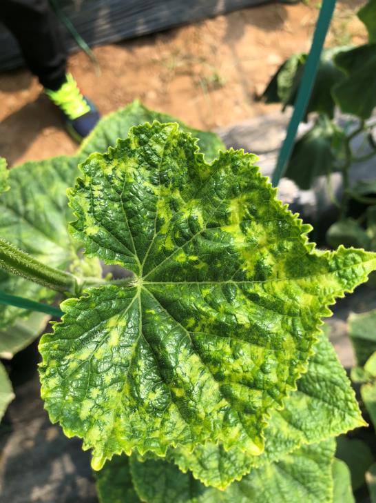 幼苗感病,子叶常变黄枯萎,成株期叶片发病出现黄绿相间或黄白相间的花叶,叶片略皱缩。瓜条发病出现深浅绿色镶嵌的花斑,凹凸不平或为畸形。