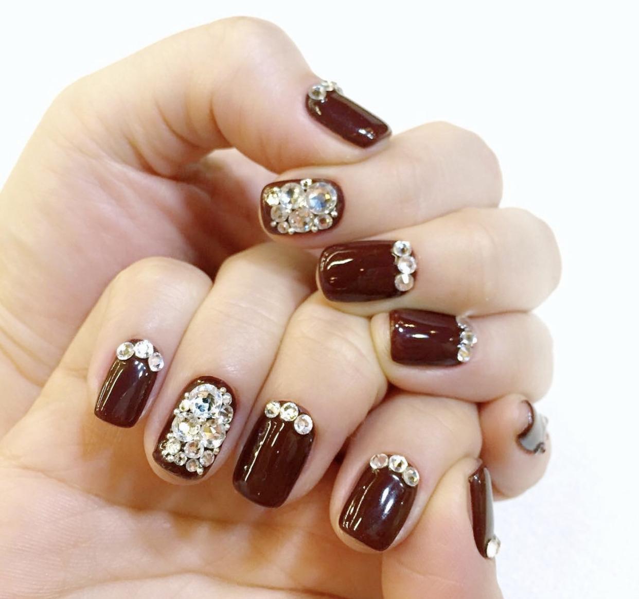 在酒红色的甲面上加上一些简约的钻石饰品,会让甲面有更加精致的效果,同时也提升了指尖的气质,这种轻奢风的设计,会提升你整个的气质。