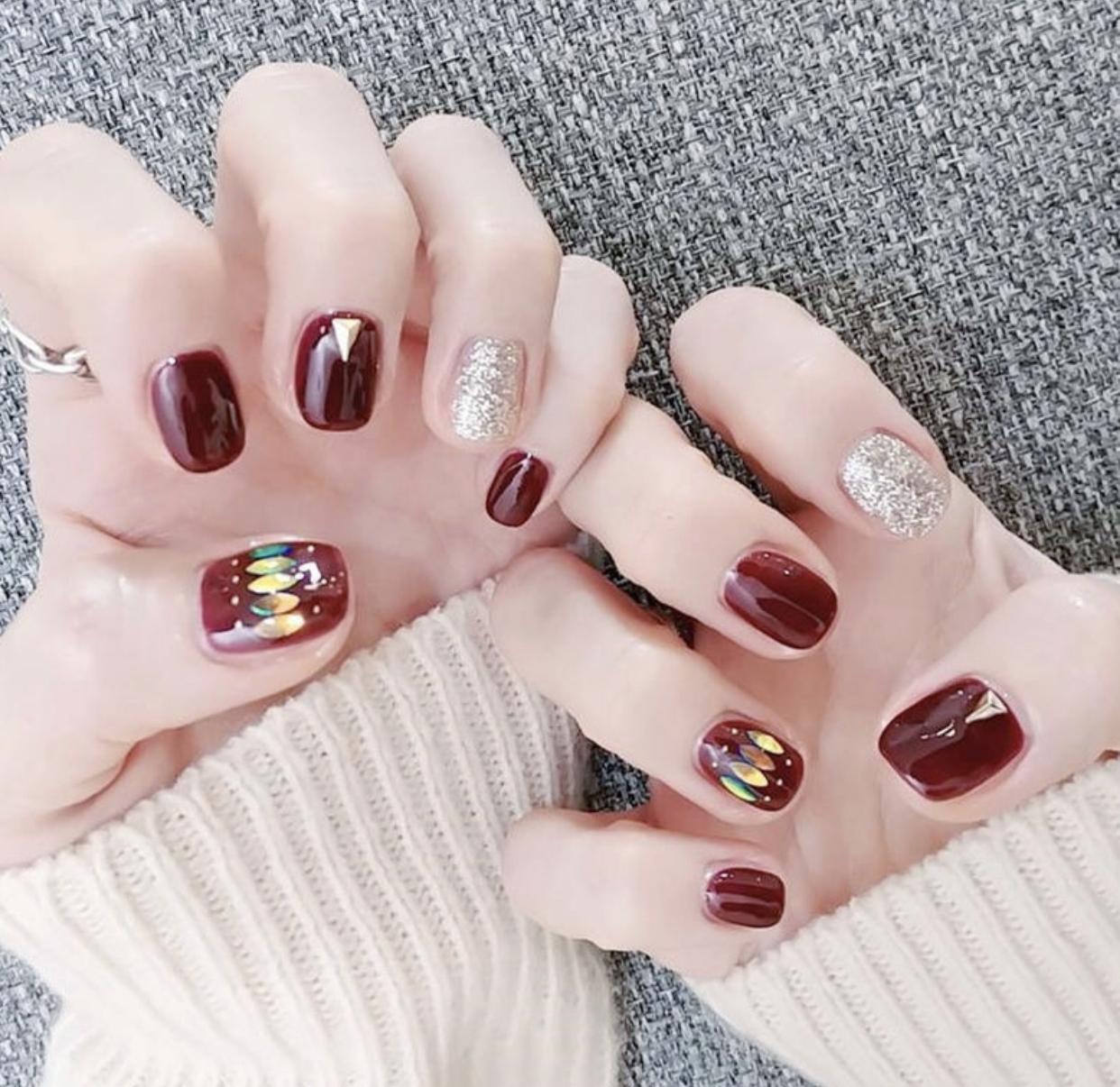 酒红色的纯色额米家,搭配银色亮片甲,简约时髦又很闪亮,是小仙女们常做的美甲款式,怎么看都非常漂亮,非常耐看哦!