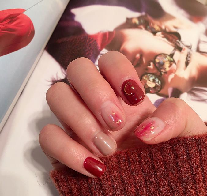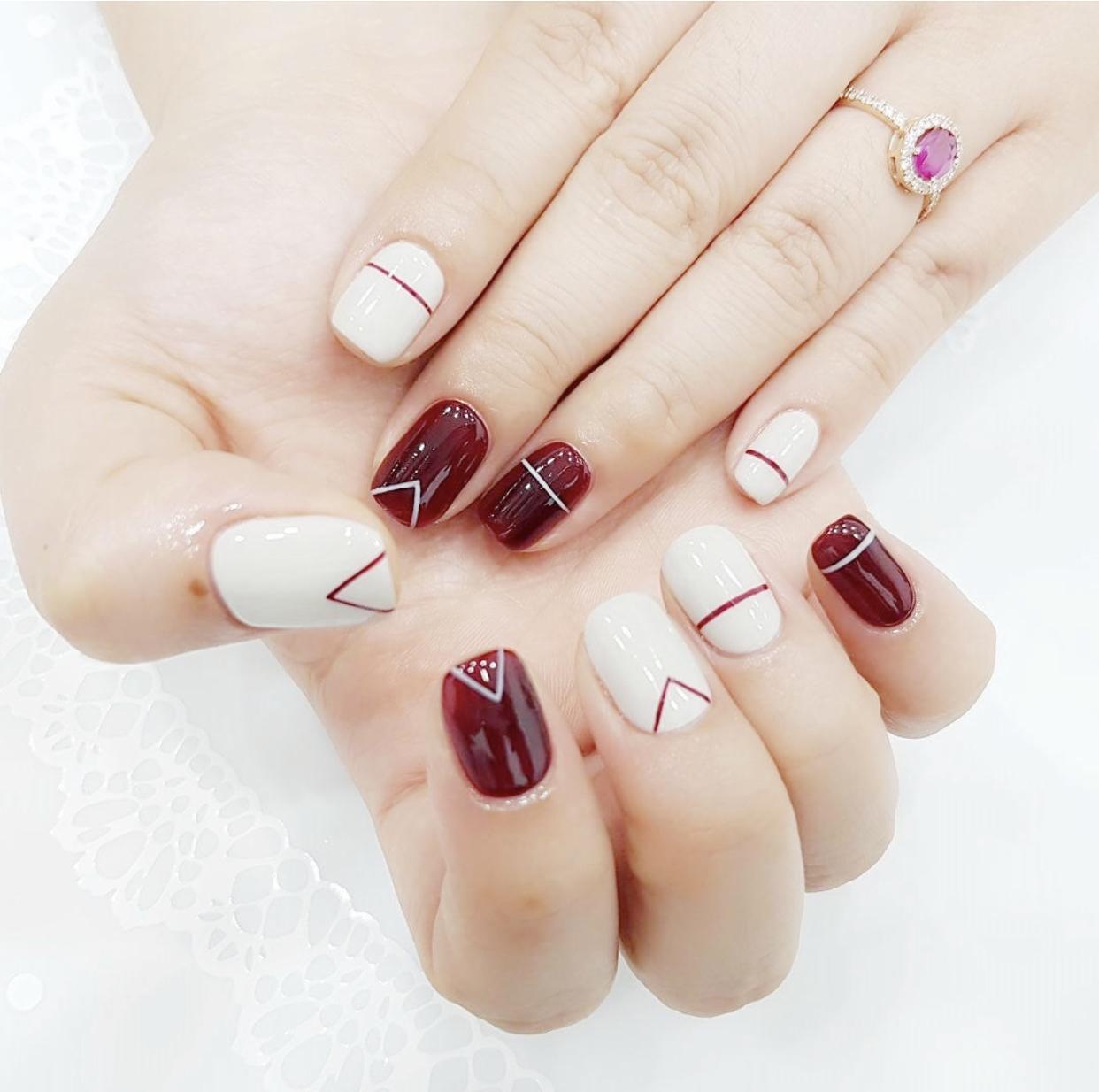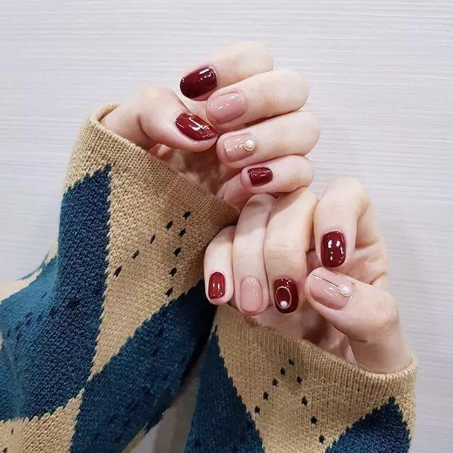 酒红色的纯色美甲,简约大方又很有气质,搭配上裸色系的美甲,会让指尖更有层次感,看起来会更甲优雅,因为裸色中和掉了一部分酒红色的艳丽,让整款美甲看起来更加和谐了。