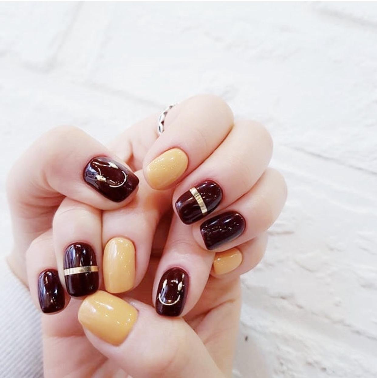 除了在纯色美甲上做出的改变,用酒红色来打造出优雅的法式美甲,也是很不错的选择哦~加上一些金线和金属饰品,会让甲面看上去非常有精致感,同时这种拼接效果,看起来也会更加时髦哦!