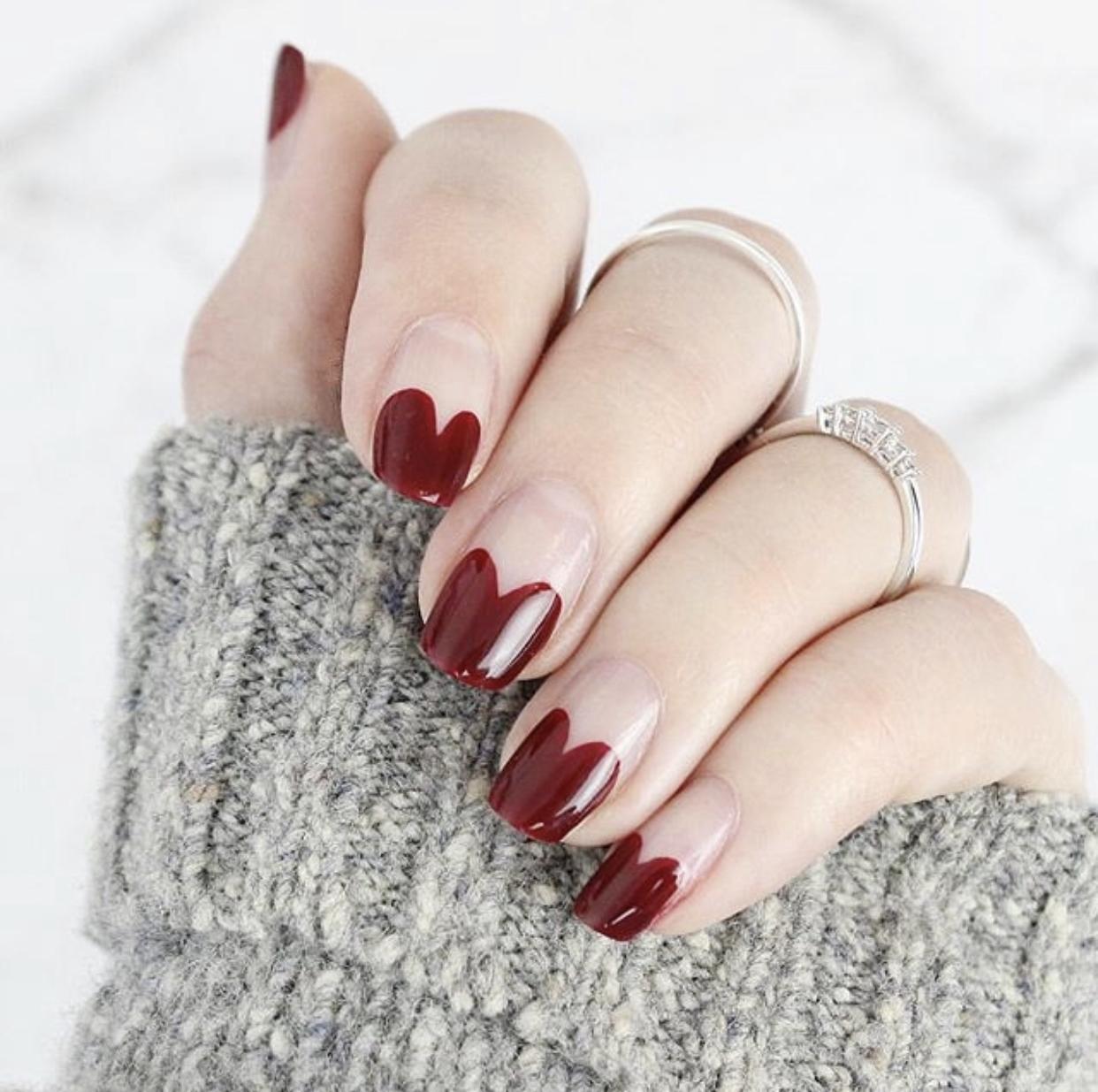 酒红色打造的各种造型的法式美甲,看起来都会格外的大气、时髦,酒红色自带的强大气质,让即使是非常简约的看款式,也会显得很有feel。