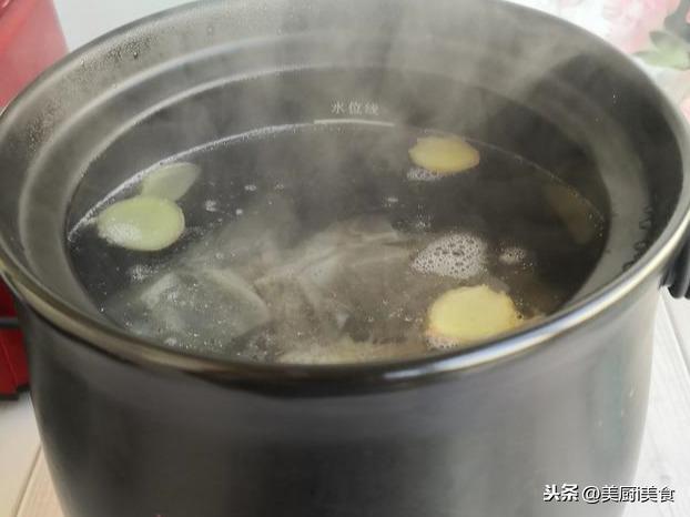 7、生姜切片、大葱切段,一起放进炖锅里,大葱也可以用小葱代替,小葱不用切,打个结放进去即可;