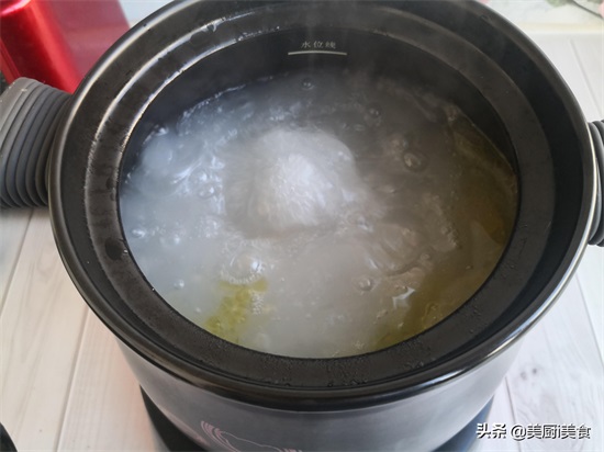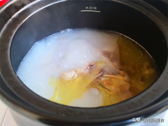 10、看锅里的水位线和汤色变化,能看出来,这是炖煮了2.5小时小时时的汤的状态。划重点:汤还没炖好之前,不要放盐;