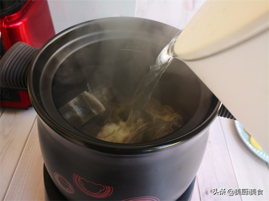 6、骨头放入炖锅里,倒入热水。划重点:一定要热水,也可以事先在炖锅中把水烧好,将焯过水的骨头直接放进去开炖,炖锅最好是砂锅,不要用铁锅;