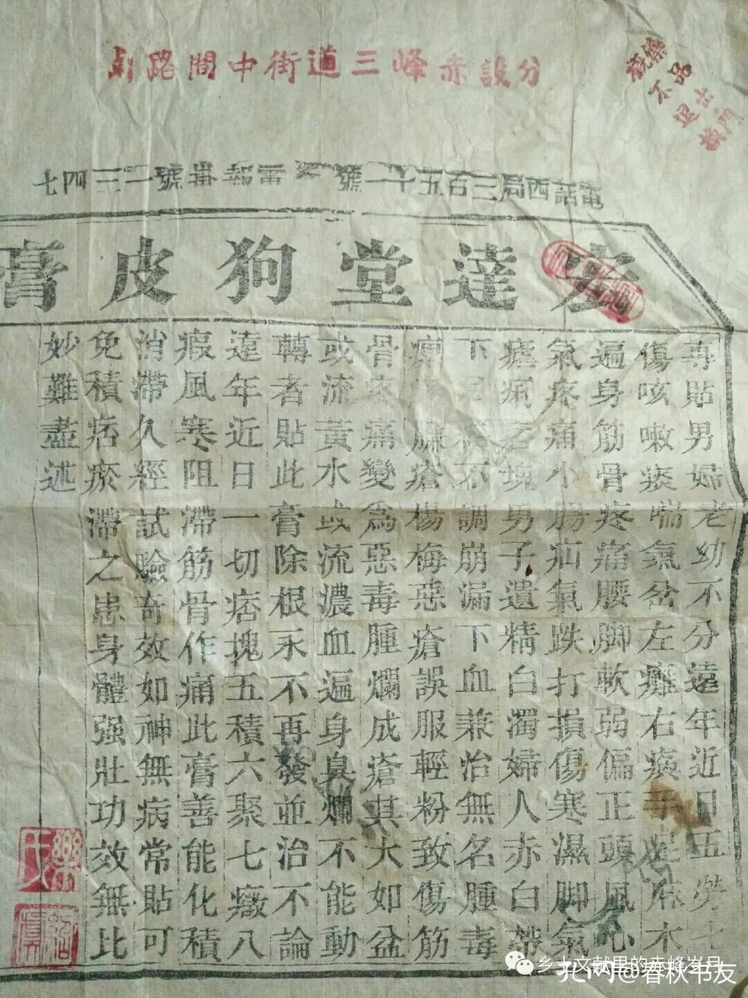其三,广告宣传做得好。乐绍虞在赤峰开设的宏达堂经营规模虽然不如赤峰本地的德盛恒等药店,但宣传做的肯定是最棒的。我看过一些民国时期的药品“仿单”,大多印制粗糙,字迹模糊,而宏达堂的“仿单”则印制精良,字清爽目,有的还盖有乐绍虞本人的印章,有“以人格做担保”的信誉保证之意。以“秘制固肾保真膏”仿单为例,长长的一大张,除详尽药品说明、使用方法外,还画有使用示意图,标明人体穴位与对应病症贴敷之处,真的是贴心之作。相比之下,我看过的“仿单”虽达不到“不堪”的程度,但也是平淡无奇。另外宏达堂的仿单版面清爽,不像一般的民国广告,色泽艳俗,花里胡哨的一片。乐绍虞还把广告宣传做到了膏药上,宏达堂的小贴万应膏,一面印有堂号和药品说明,一面则印有“北平同仁堂铺东、宏达堂主人乐绍虞敬赠”章,说明宏达堂还开展买药赠药的活动,在您接受馈赠的同时,这一贴小小的膏药相当于乐绍虞的名片也随即呈上。