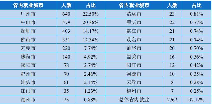 该校毕业生的就业区域主要是集中在珠三角城市,占比为86.5%,其次是粤东地区。珠三角城市就业最多的就是广州市,其次是中山市,再然后才是深圳市。