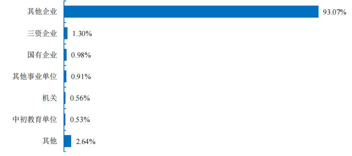 该校毕业生就业单位主要是以民营企业为主,占比高达93.07%,三资企业为1.3%,国有企业占比只有0.98%。该校毕业主要还是民营企业为主,进入国家单位的还是非常少的。
