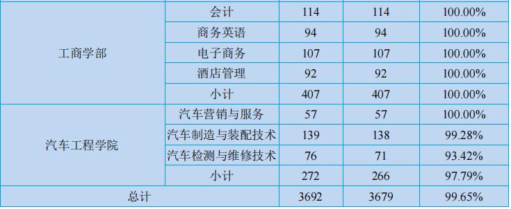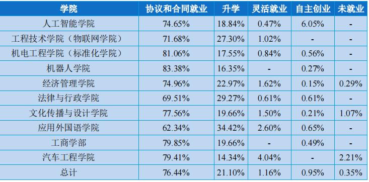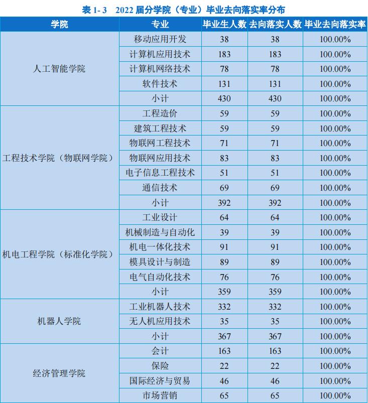 各个学院毕业去向落实率是非常高的,很多学院的就业率都达到了100%,比如人工智能学院、工程技术学院、机器人学院等,就业率都是100%。其他学院,大家看图。