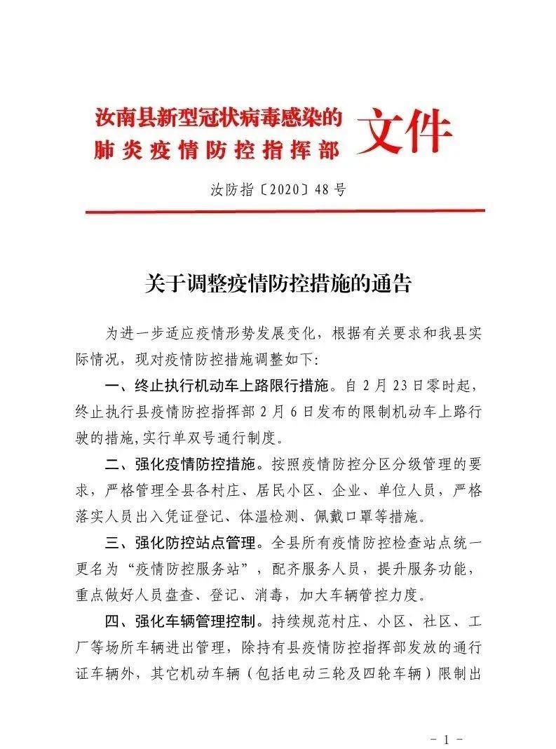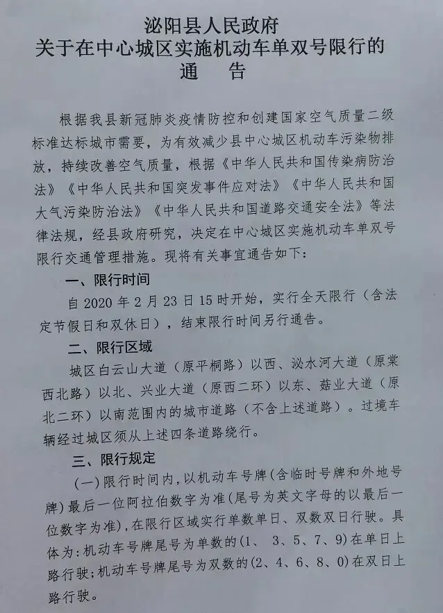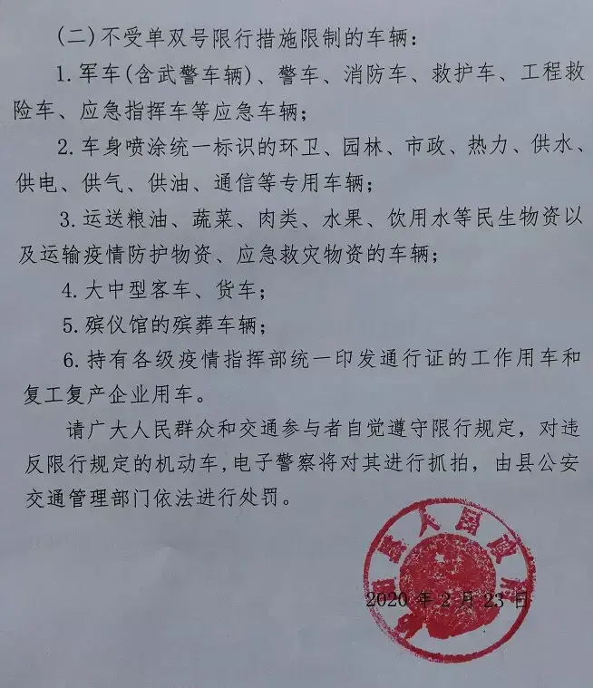 一、终止执行机动车上路限行措施。自2月23日零时起,终止执行县疫情防控指挥部2月6日发布的限制机动车上路行驶的措施,实行单双号通行制度。