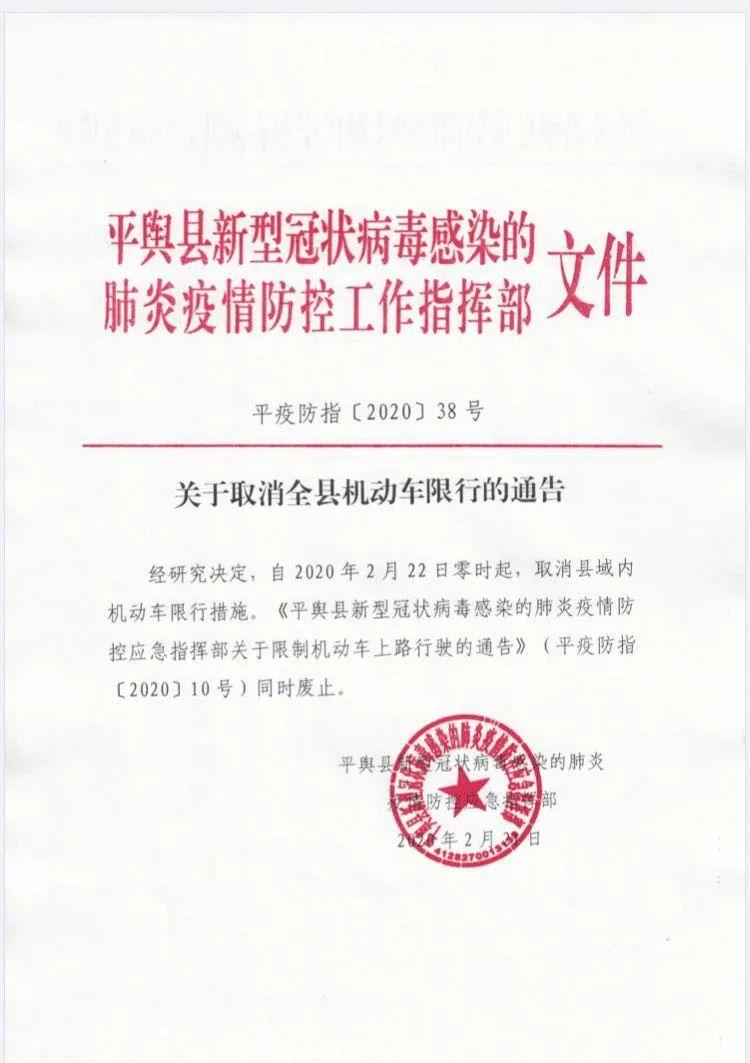 经平舆县新型冠状病毒感染的肺炎疫情防控应急指挥部研究决定,自2020年2月22日零时起,取消县域内机动车限行措施。《平舆县新型冠状病毒感染的肺炎疫情防控应急指挥部关于限制机动车上路行驶的通告》(平疫防指〔2020〕10号)同时废止。