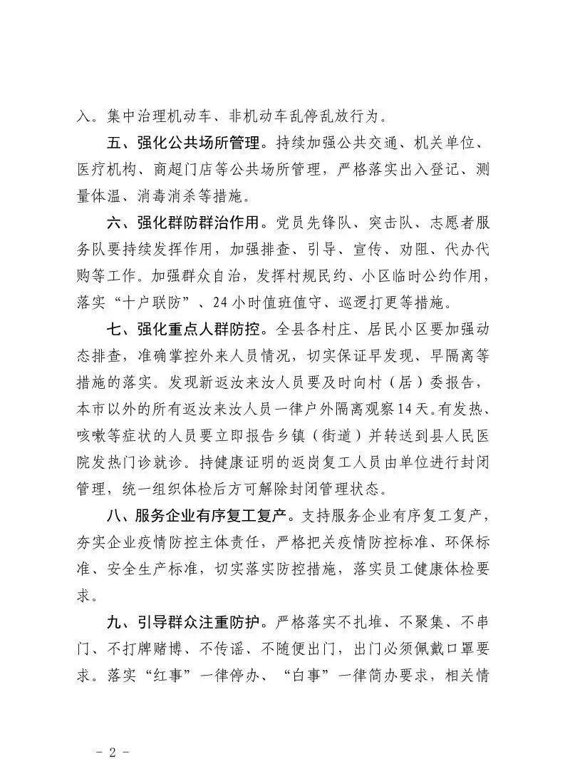 二、强化疫情防控措施。按照疫情防控分区分级管理的要求,严格管理全县各村庄、居民小区、企业、单位人员,严格落实人员出入凭证登记、体温检测、佩戴口罩等措施。