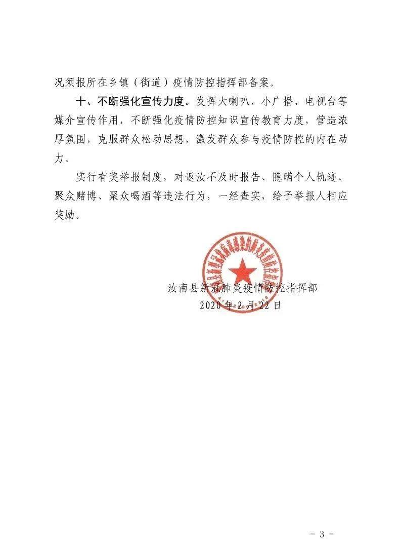 七、强化重点人群防控。全县各村庄、居民小区要加强动态排查,准确掌控外来人员情况,切实保证早发现、早隔离等措施的落实。发现新返汝来汝人员要及时向村(居)委报告,本市以外的所有返汝来汝人员一律户外隔离观察14天。有发热、咳嗽等症状的人员要立即报告乡镇(街道)并转送到县人民医院发热门诊就诊。持健康证明的返岗复工人员由单位进行封闭管理,统一组织体检后方可解除封闭管理状态。