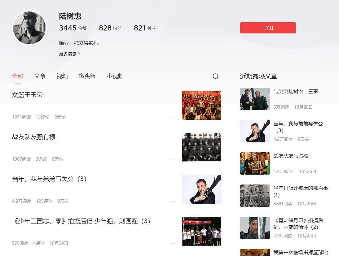 大略看了下,他的作品也不少,怎么也有百条左右吧。 看个人简介是爱好摄影! 自此不能看出,应该是一个喜欢生活,喜欢写作,喜欢分享的一个人,文笔做工很不错。在10月之前所有的文章中没有说过这个优秀的弟弟陆树铭,你有没有觉得弟弟优秀,这个哥哥就觉得很黯淡无光,而且以前对这个弟弟总是说一不二的一个人,也是他的榜样,弟弟的突然成功,让这个哥哥心理的变化,估计很复杂。 很多事情也失去了话语权,