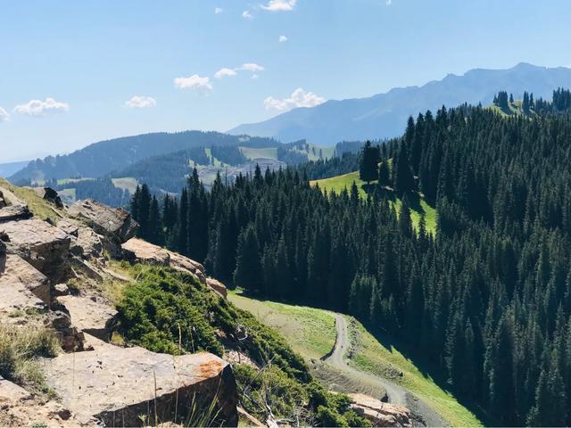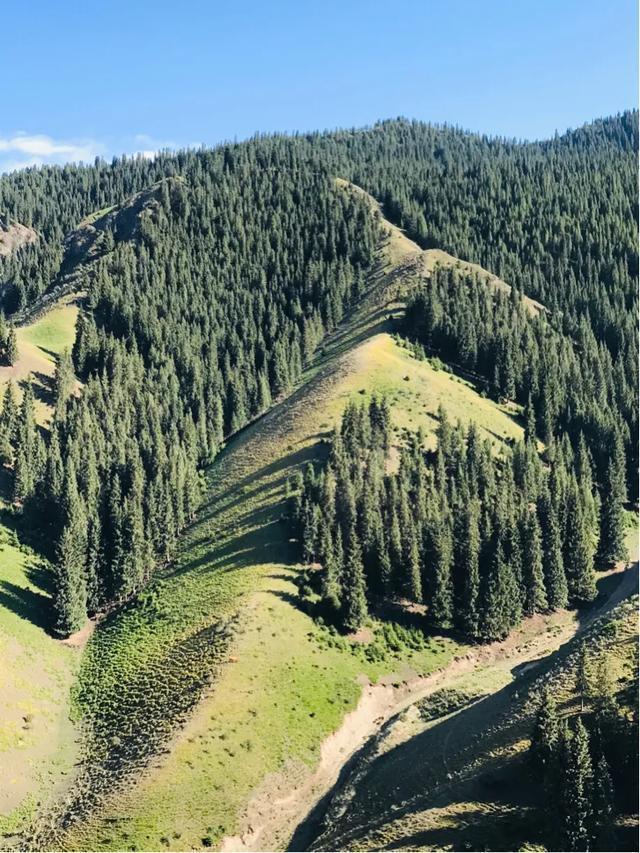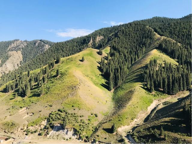 这里一向是哈萨克牧民的冬牧场,草原开阔,水草丰茂,周围峰峦迭嶂,满山苍松翠柏,一派郁郁葱葱,整个是绿山碧野、满目葱翠。