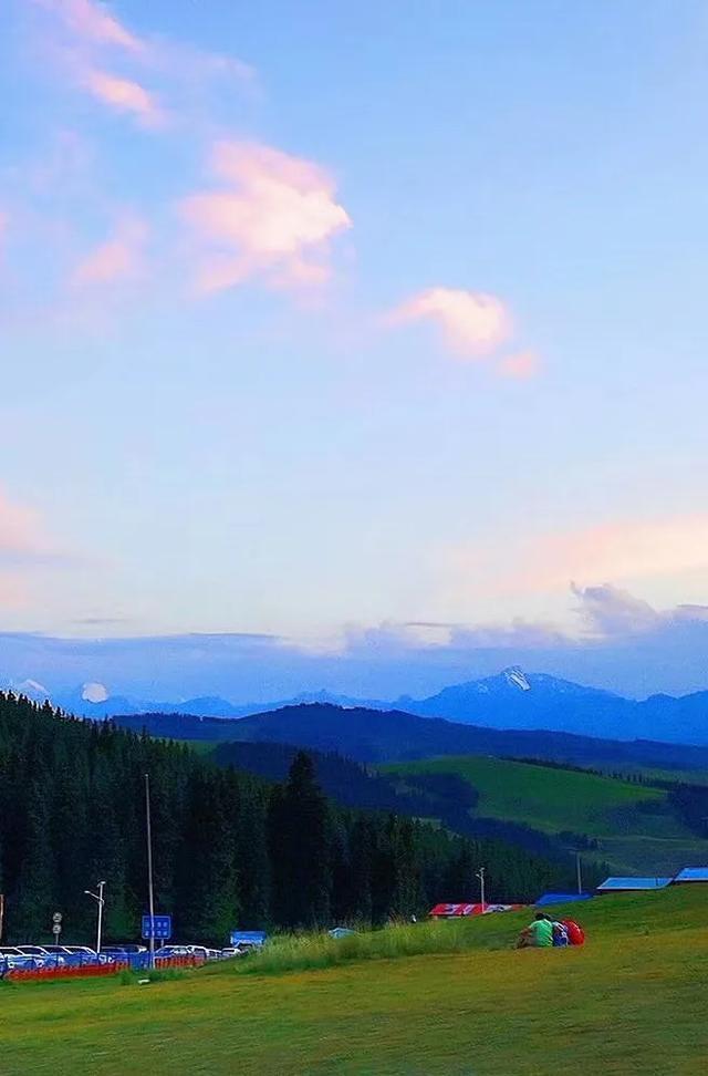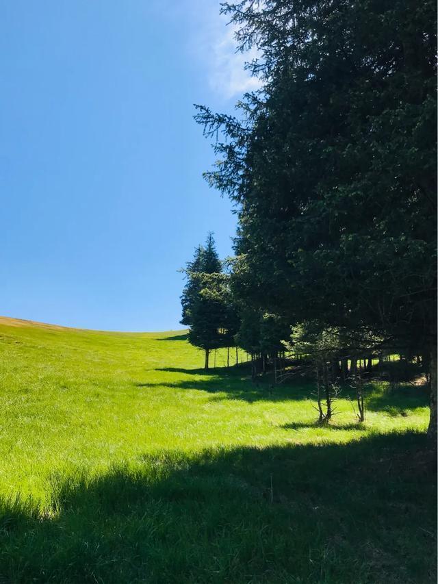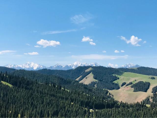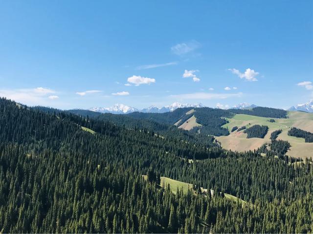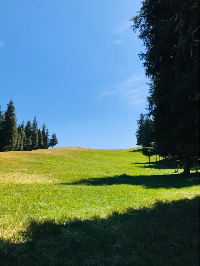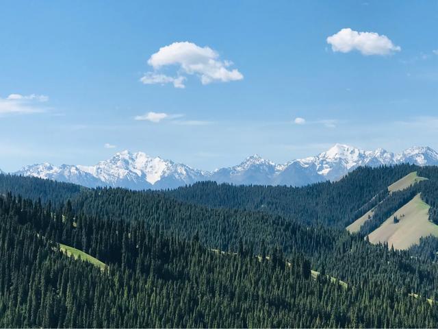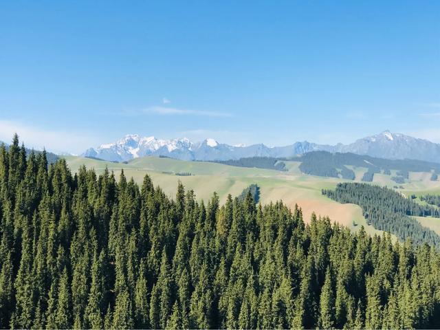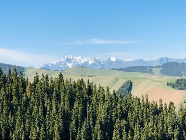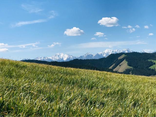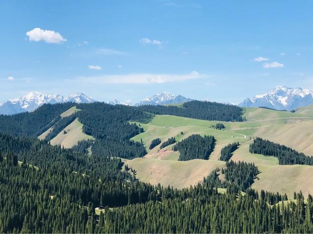 放眼浩瀚起伏的草原,绿草如茵、百花吐芳、格外宜爽。远处是绵延的银色雪峰,附近谷壑宏深,松林似海,雪山、松林、草甸高山之巅,极目远眺,满目青翠,一幅浓绿喷然的优美画卷尽收眼底,令人心旷神怡、亮目醒神、心肺沁润。