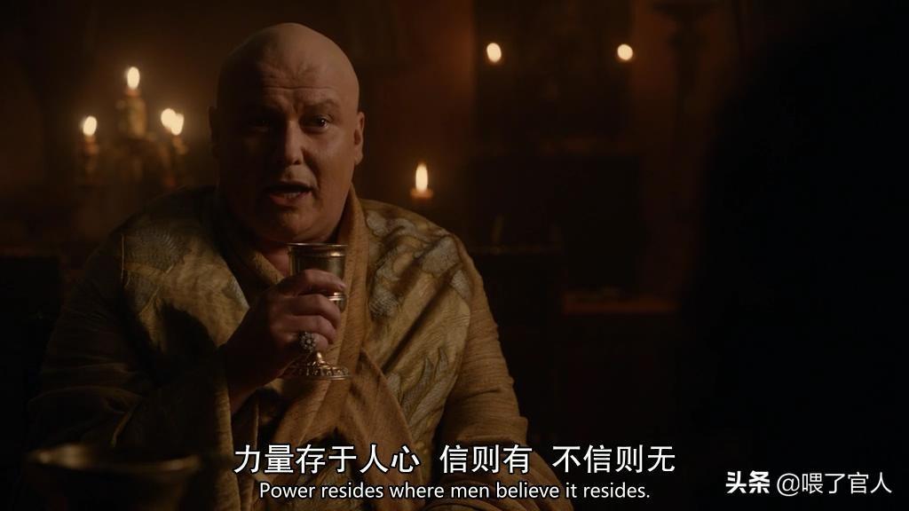 而《权力的游戏》却没有办法展示这么多的故事线,因此就把瓦里斯化身成一个忧国忧民的爱国人士。实际上,瓦里斯并没有那么精忠报国,对于权力的游戏,他应该比谁理解得都深。那段说给提里昂的谜语,可谓是将权力和政治浓缩得一语中的。