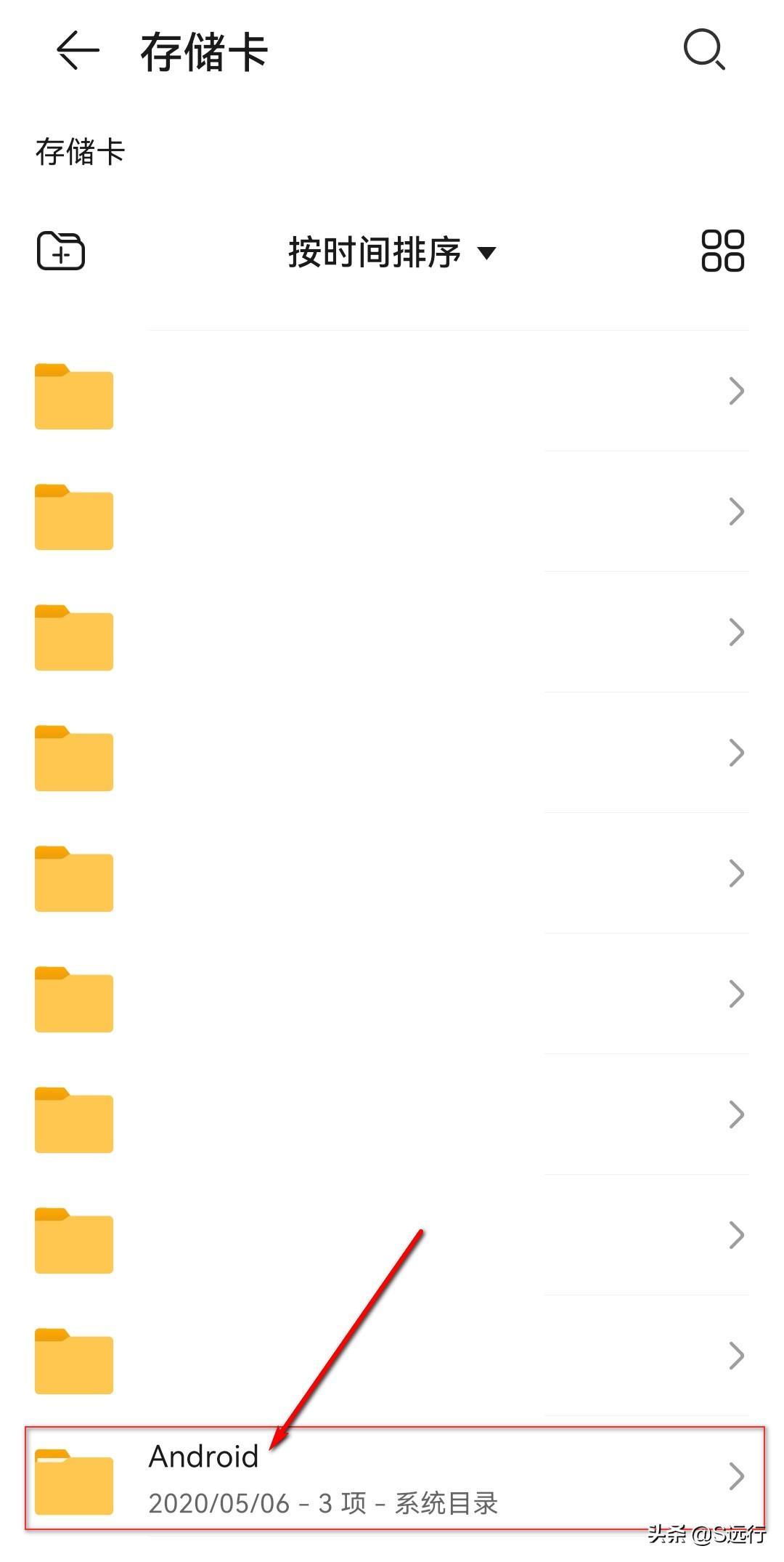 根据之前下载路径选择的不同,使用手机自带的文件查看器,分别在手机或存储卡下,点击“Android”。
