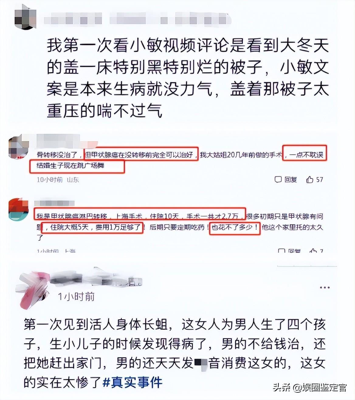 只见底下有不少网友表达了利用癌症病人博眼球捞金这种行为的憎恨,还希望严惩小敏丈夫。因为有眼尖的网友发现,早在之前也能看出一丝小敏求救的信号,小敏丈夫小陈曾晒过和癌症妻子秀恩爱的视频。