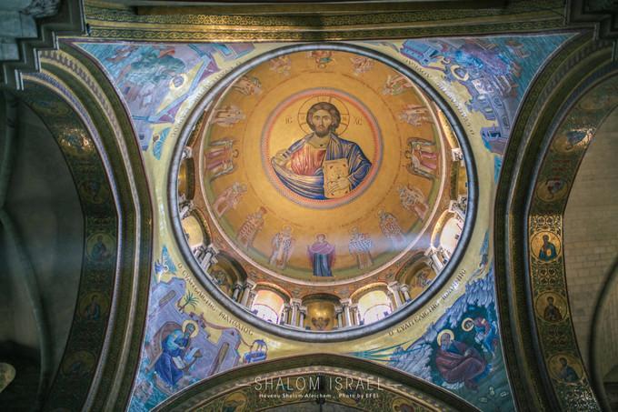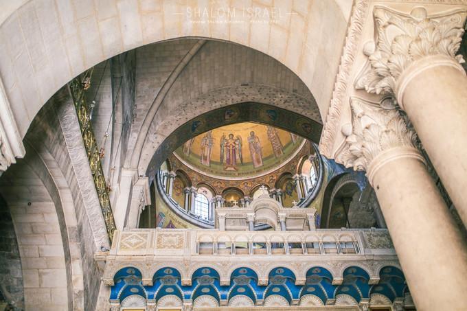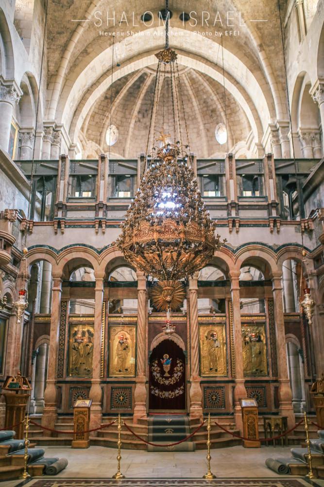 耶路撒冷圣墓大教堂内景,该教堂是耶路撒冷最重要的教堂之一。教堂内部的风格是多样的,包括东正教的风格,天主教的风格,基督教的风格,代表着基督教的七个教派。
