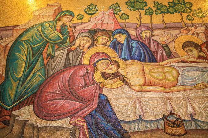墙壁上的马赛克拼贴画,画的就是耶稣从十字架下来,众人为尸体涂油,再将耶稣葬入墓穴。