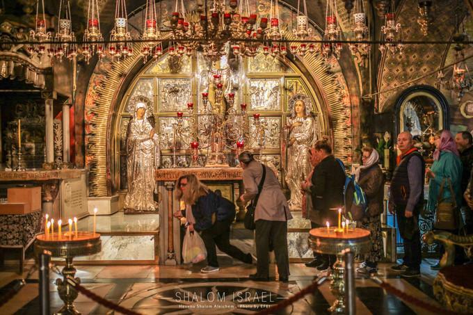 石板上方的灯分别由罗马天主教、希腊东正教、亚美尼亚东仪天主教和科普特教会等教派敬献。