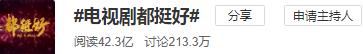 据数据不完全统计,在微博统计话题关于这部电视剧的热搜达到42.3亿,讨论达到213.3万。