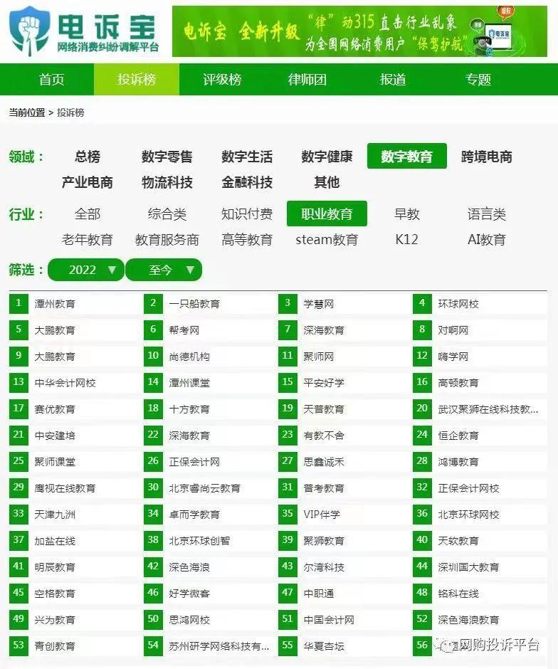 根据“电诉宝”2022年至今受理的职业教育领域用户有效投诉显示(依据投诉量排行),帮考网排名第六位。其他被投诉的类似平台依次为:潭州教育、一只船教育、学慧网、大鹏教育、深海教育、对啊网、大鹏教育、尚德机构、聚师网、嗨学网、潭州课堂、平安好学、高顿教育、赛优教育、十方教育、天普教育、中安建培、深海教育、有教不舍、恒企教育等。