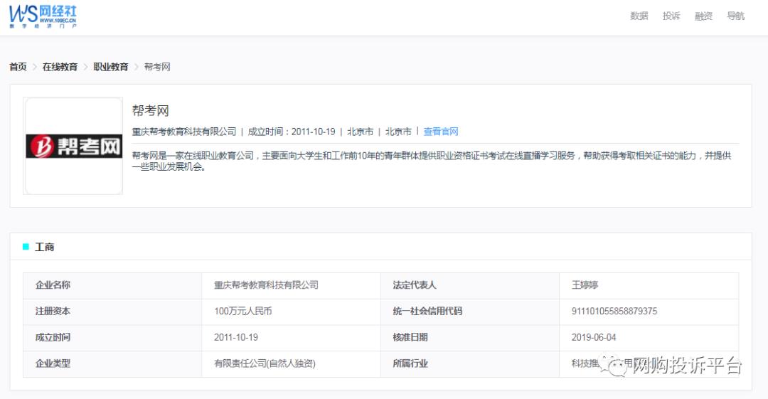 据网经社企业库(COP.100EC.CN)显示,“帮考网”隶属于重庆帮考教育科技有限公司,成立于2011年10月,法定代表人王婷婷,注册地位于重庆市永川区,是一家在线职业教育公司,主要面向大学生和工作前10年的青年群体提供职业资格证书考试在线直播学习服务,帮助获得考取相关证书的能力,并提供一些职业发展机会。