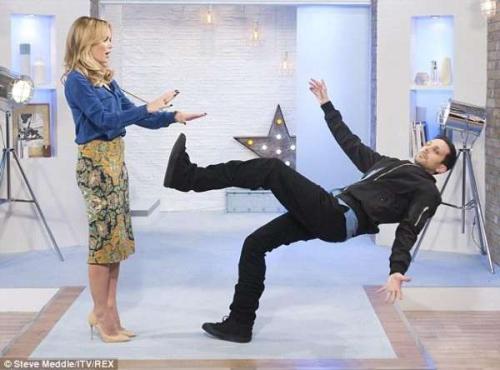 表演者用一把手扶着一根拐杖,身体就可以悬浮在空中。