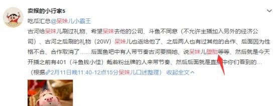 古河先在户外主播一哥钱小佳直播间爆料,暗指“呆妹怀孕”和等黑料,随后把一张呆妹说钱小佳蹭她热度的聊天截图发给了钱小佳。钱小佳就生气了,在直播间骂了几句,呆妹就骂回去了,随后事态在节奏党影响下逐渐失控。之后又有另外的老哥爆料呆妹儿曾经DT的截图,呆妹开始失控。随后钱小佳想和呆妹互相道歉然后了事,然而过程却很尴尬,因为呆妹儿跟钱小佳电话连线之后,突然没音了。