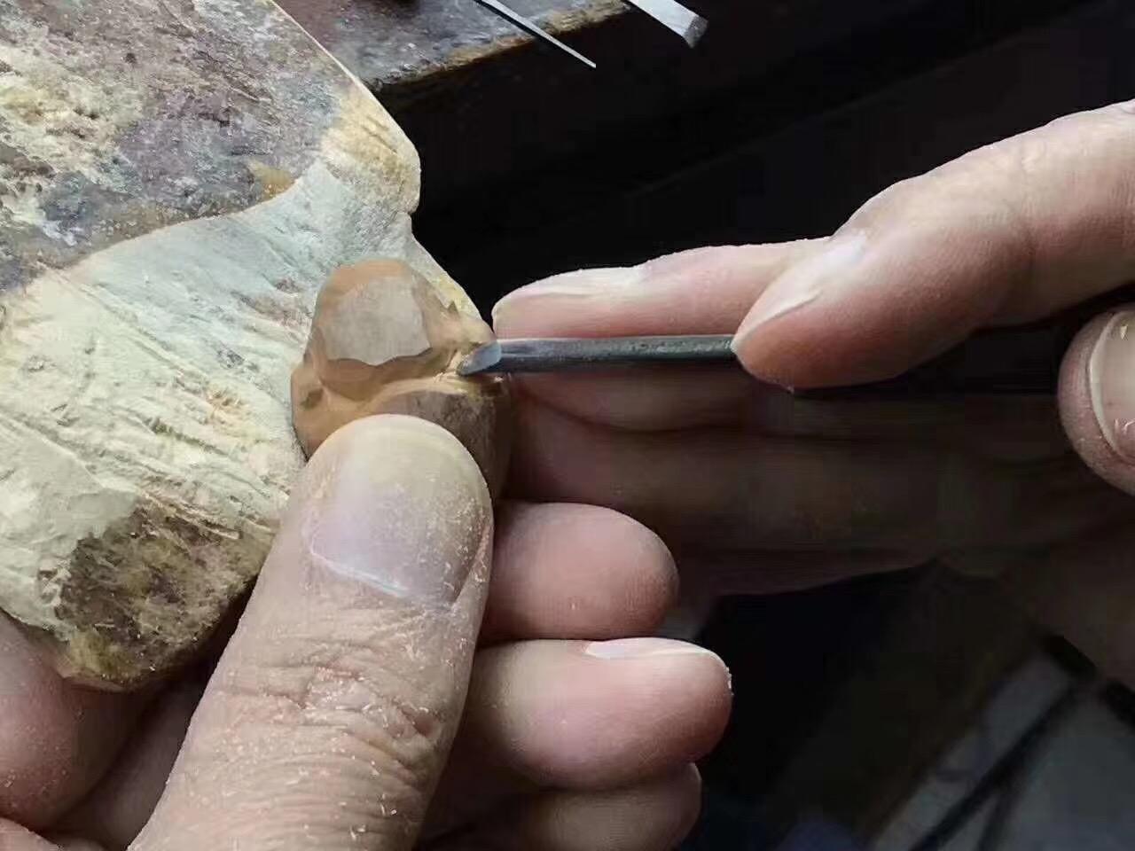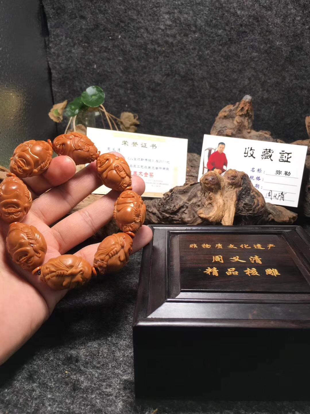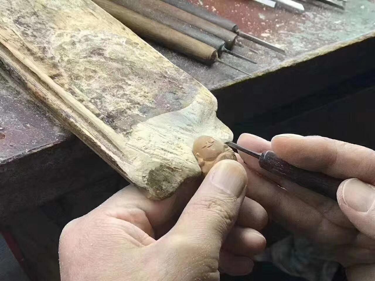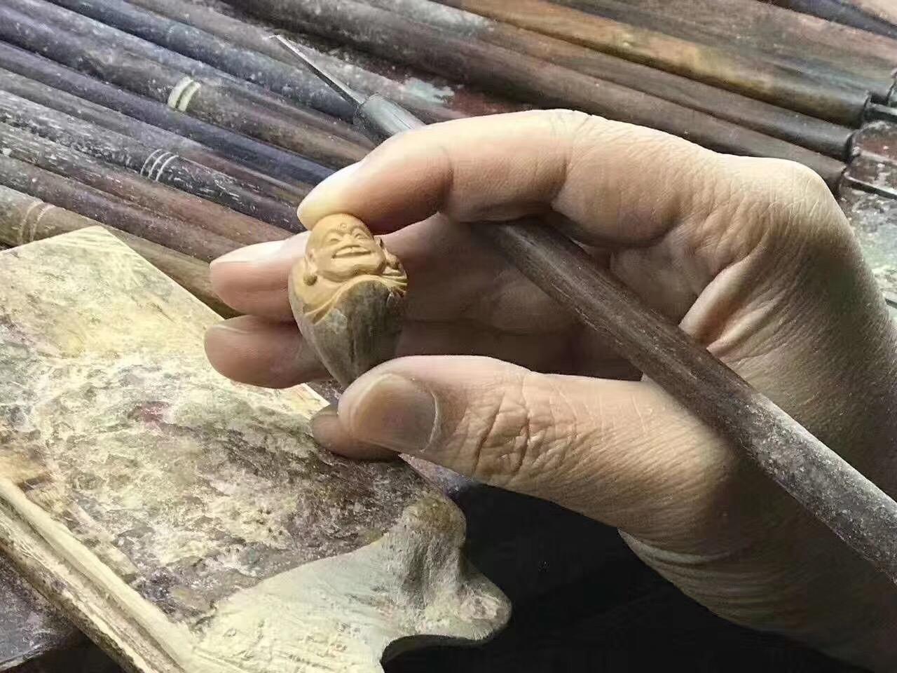 周义清雕刻弥勒都是他自己包的紫皮核树,作品到最后打孔,用的是传统的工具和方法,优点是圆滑,他喜欢雕刻弥勒,接下来给大家介绍一下