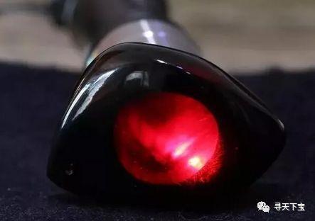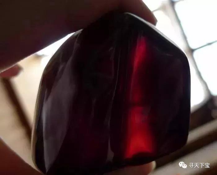 区分瑿珀跟黑皮血珀,最直观就是用强光手电从琥珀背面紧贴着打灯,然后从正面观察。光能聚在一起的就是瑿珀,正面的光亮区域几乎就是手电的头部大小。而黑皮血珀正面观察红光是扩散状态。如果把平面再打磨一下,这种扩散效应会更加明显,整个珀体都会通体红,而瑿珀即使再打磨平整,也依旧是将光聚在一起。