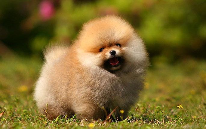 纯种的博美犬尾巴高跷于背部,高高地,水平地由背部直达耳部,更加衬托出该犬种的短背。