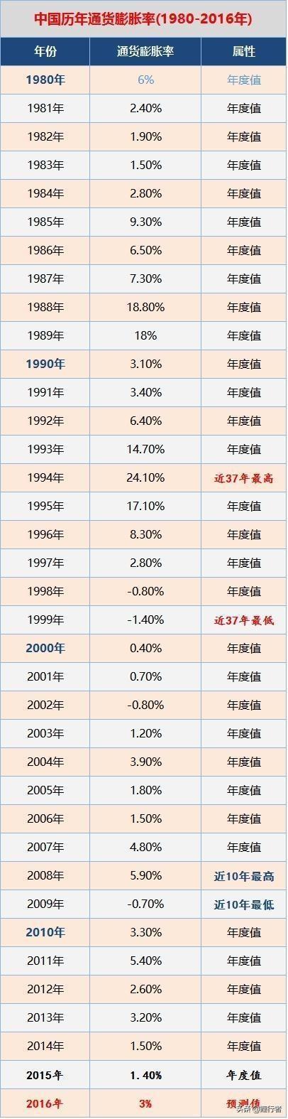 那1982年的1.6亿元相当于现在的多少钱呢?要计算这个结果我们就要知道这37年的通货膨胀率有多少?下图是近35年的通胀率,按照官方公布的通胀率在加上近2年的通胀率,可以算出这37年的平均通胀率在5.2%左右。也就是说那时候的1.6亿就相当于现在的1.6亿*(1+5.2%)^37=10.44亿。