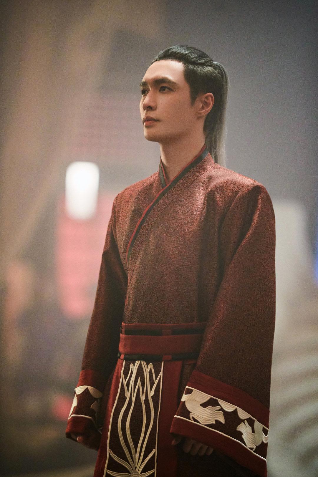 发型上依然不失帅气,一个扎起的红色小马尾个性十足,时尚感觉扑面而来,即便是古装也能感受到一种浓浓的男团风,古装袖口的云纹图案突显出一份精致的感觉。