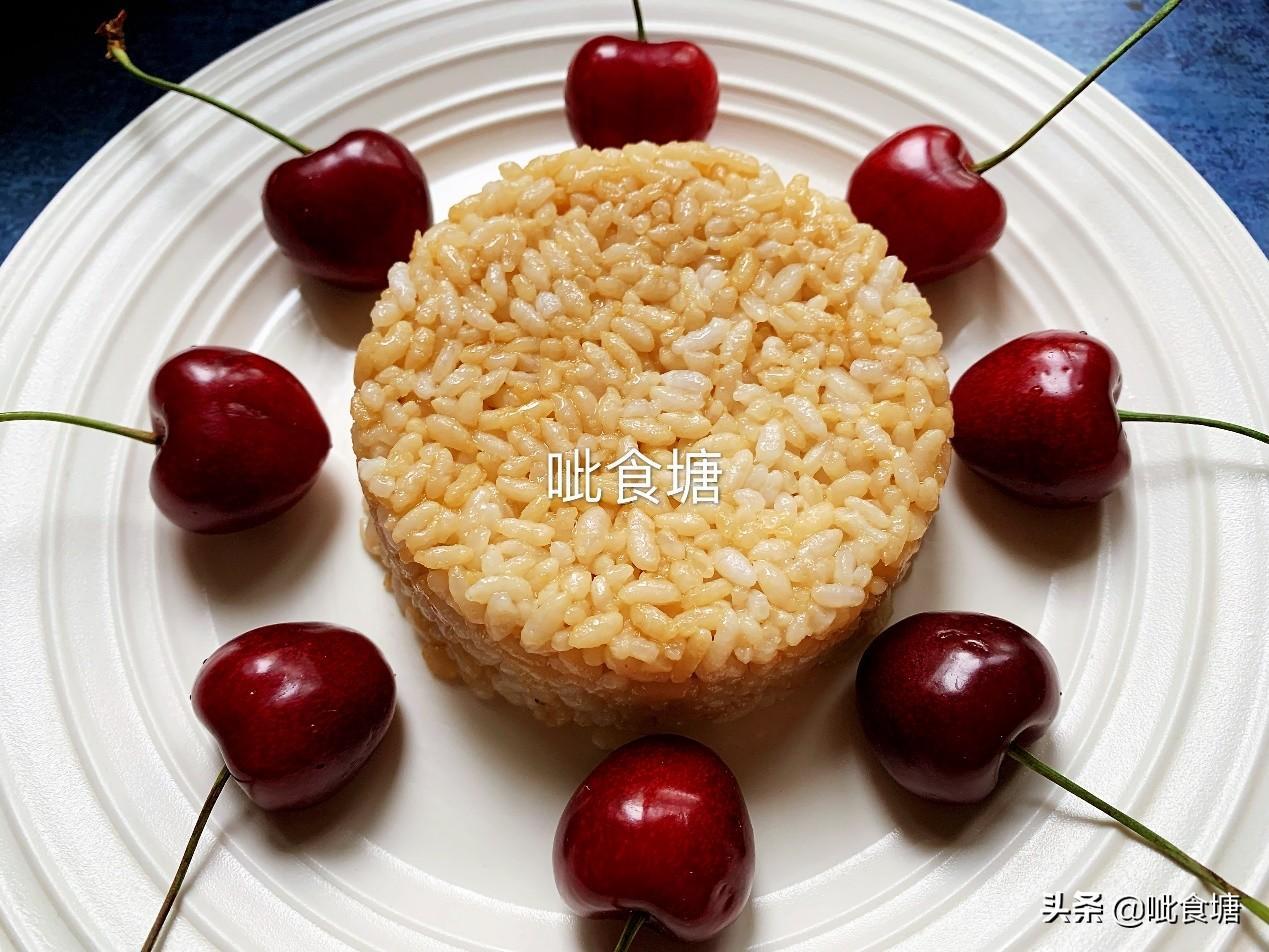 4、把碗里的米饭倒扣在盘子上。周边点缀樱桃。