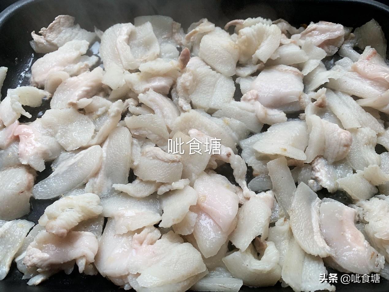 1、 肥猪肉切片,锅中放入清水、姜、花椒熬至成金黄酥脆的油渣。