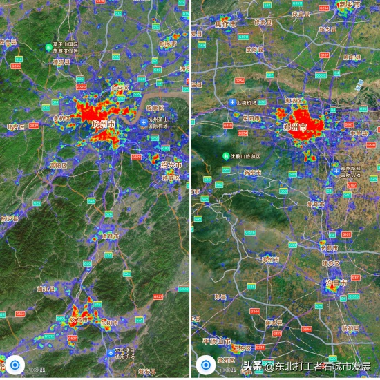 一方面郑州区人口跟杭州差距很大,因此繁华程度比不过杭州。放眼望去杭州城区人口数量突破800万,郑州刚突破500万。市辖区数量杭州有10个,郑州只有6个。若不是新郑市、荥阳市、中牟县紧挨着郑州市区,恐怕这两个城市繁华程度差距会更加悬殊,从图上可以看得非常直观。