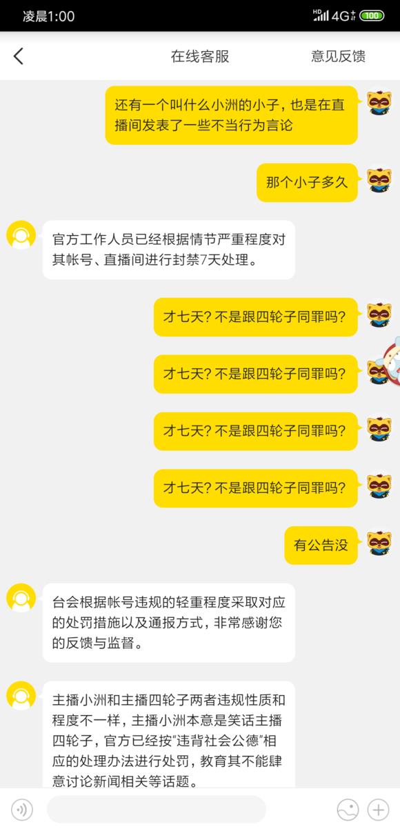 昨天网络上流传的小洲视频,发出来的后来被删掉,没发出来的显示审核不通过,有粉丝认为开始公关删帖了,毕竟小洲是大主播,对YY平台的影响还是非常大的。有粉丝询问YY官方小洲封禁时间,官方给出的答复是7天,粉丝质问为何与四轮子差别如此之大。官方称两人的违规性质和程度不一样,小洲本意是笑话四轮子,已经按“违背社会公德”的处理办法处罚。