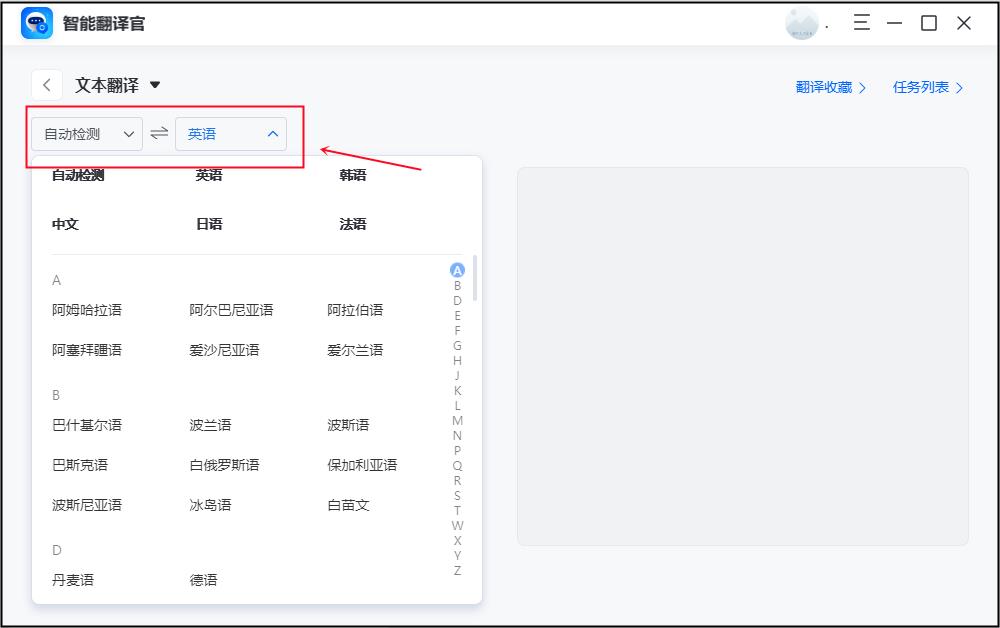 由于【文本翻译】会帮助我们即时翻译,为了在翻译过程中不出现错误,我们需要先对翻译语言进行调整。在新页面的右上角,点击两个下拉箭头就可以切换翻译语种啦。可以看到这里有很多种语言供我们选择,如果我们有其他翻译需求也可以用这种方式解决哦。