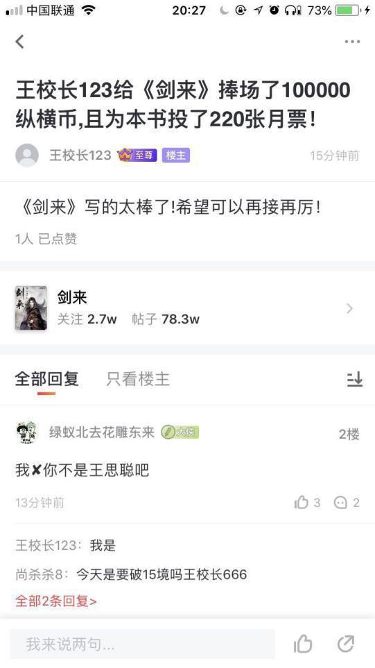 可见《剑来》在读者心目中的地位,如果哪本网络小说能够证明自己的实力,或者与传统文学作品匹敌,《剑来》绝对是其中之一,连王思聪都打赏27000元的网络小说,还不快快进来围观!