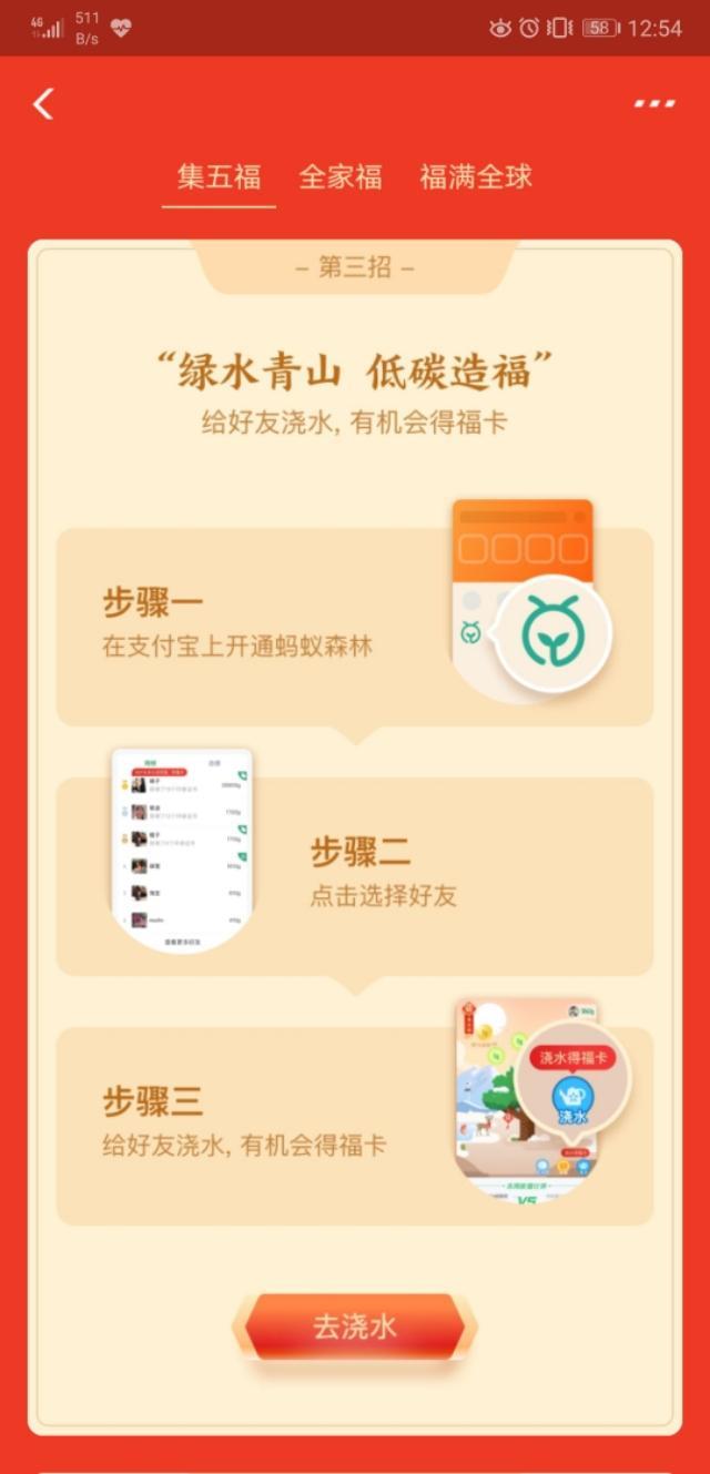 第三招“绿水青山,低碳造福”,在支付宝蚂蚁森林中,给好友浇水有机会获得福卡,这种方式每天最多2张。