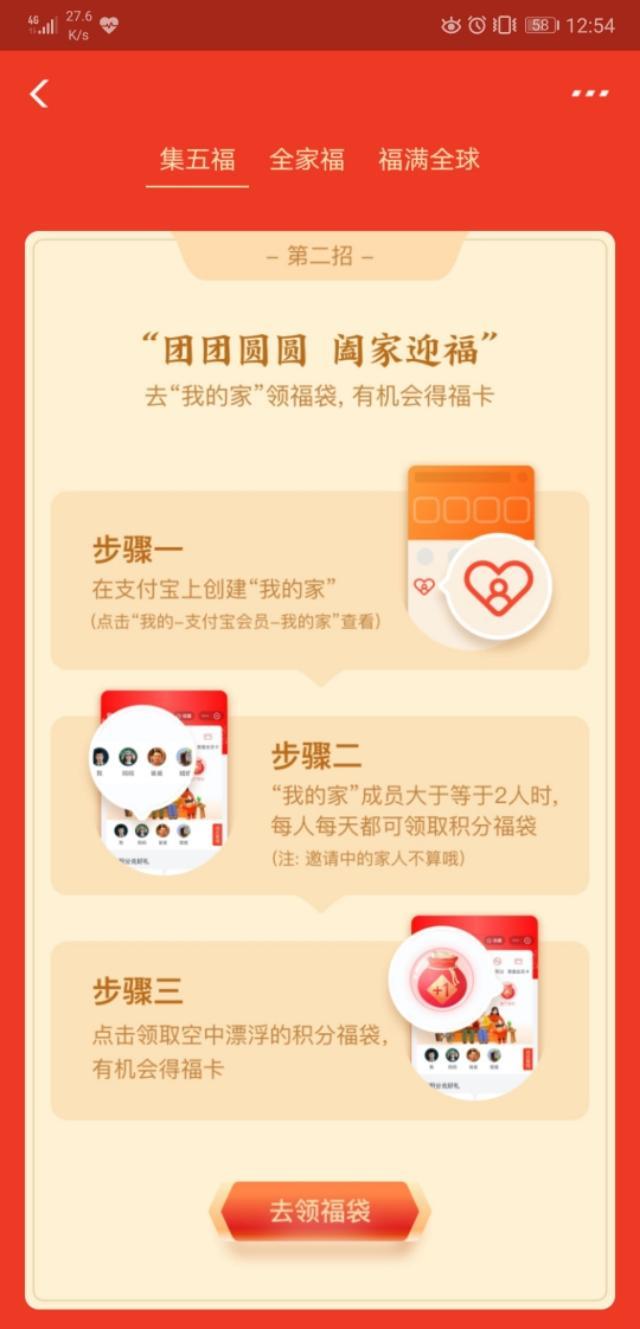 第二招“团团圆圆,阖家迎福”,在支付宝小程序创建“我的家”,只要成员大于等于2人,没人每天可以领取一个积分福袋,开出一张福卡!