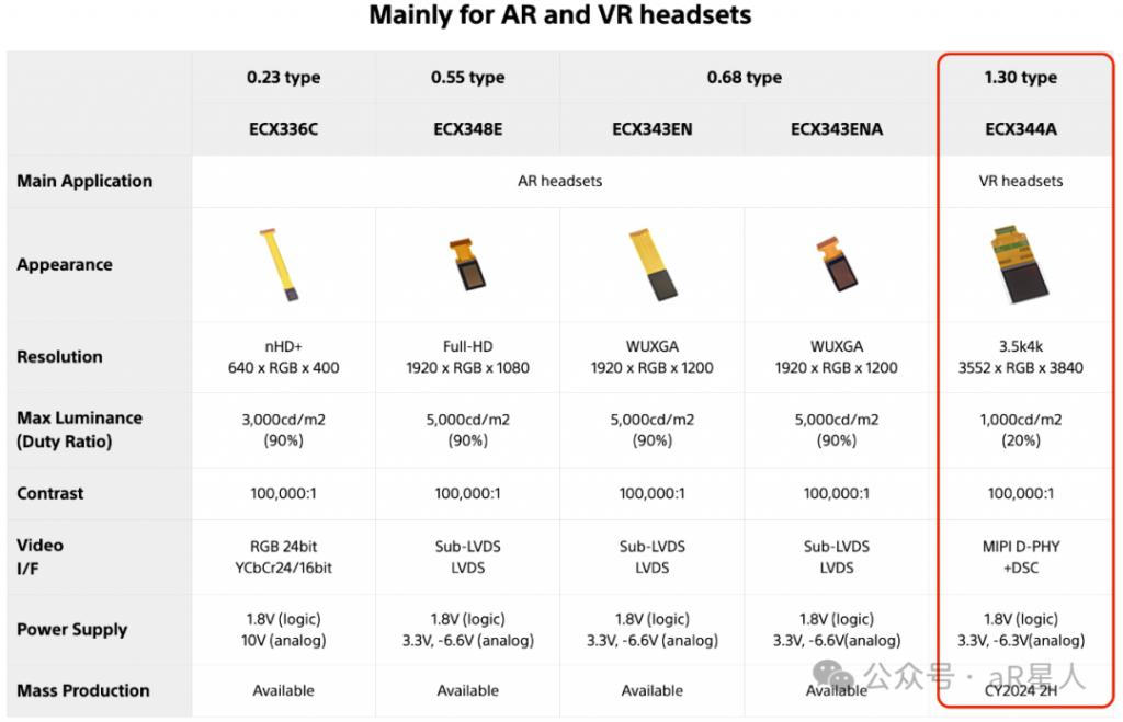 2023 年年中发布的 Apple Vison Pro,采用了 4K 分辨率的昂贵 OLED 微显示屏,(型号可能是官网显示的 1.30type ECX344A),相比 2023 年上半年发布 Rokid Max,还停留在 1080P 分辨率。