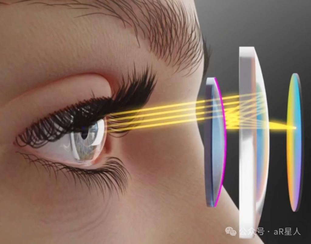 Apple Vision Pro 所使用的多透镜 Pancake 折叠放大光路,图像光源来自眼睛前方的微显示屏