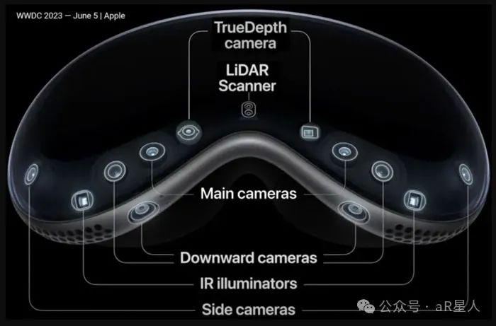 这种垂直视角的摄像头,专门用于捕捉大部分时间、不抬手的时候的手势,因为很多时候双手应该自然垂放在腿或桌子上,符合人体工学逻辑。苹果 Vision Pro 是 AR/VR 中的首家采用这一方案的设备,属于独一份。