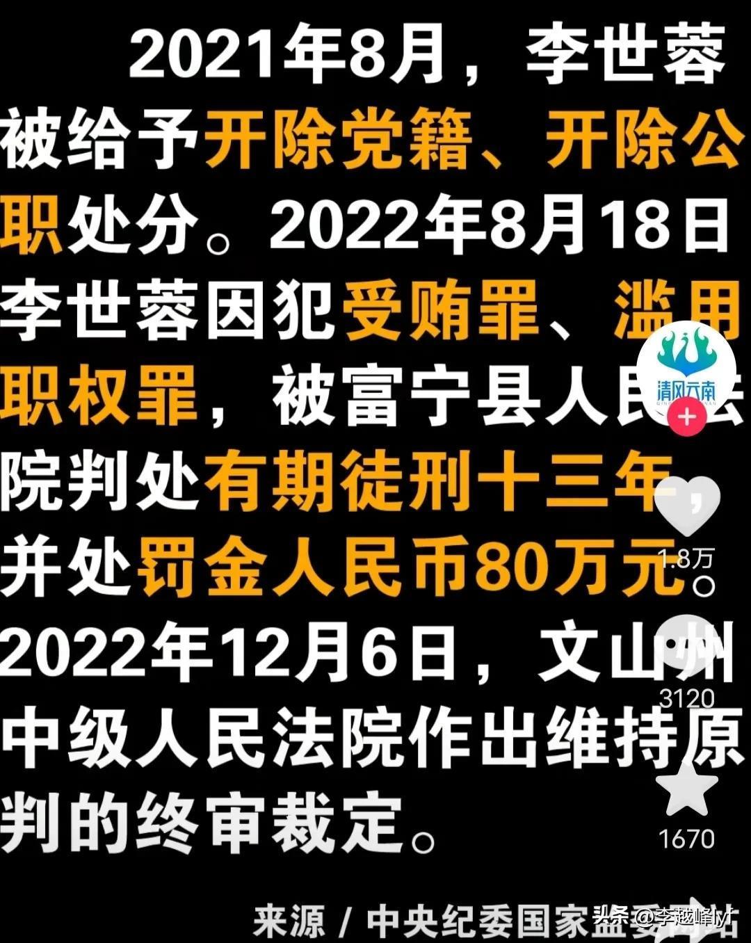 2021年8月份,李世蓉被组织双开(开除党籍、开除公职),同时,她因为犯下滥用职权罪以及受贿罪,2022年8月18日,被富宁县人民法院判处有期徒刑13年,并处罚金80万元,2022年12月6日,文山州中级人民法院,终审裁定维持原判。